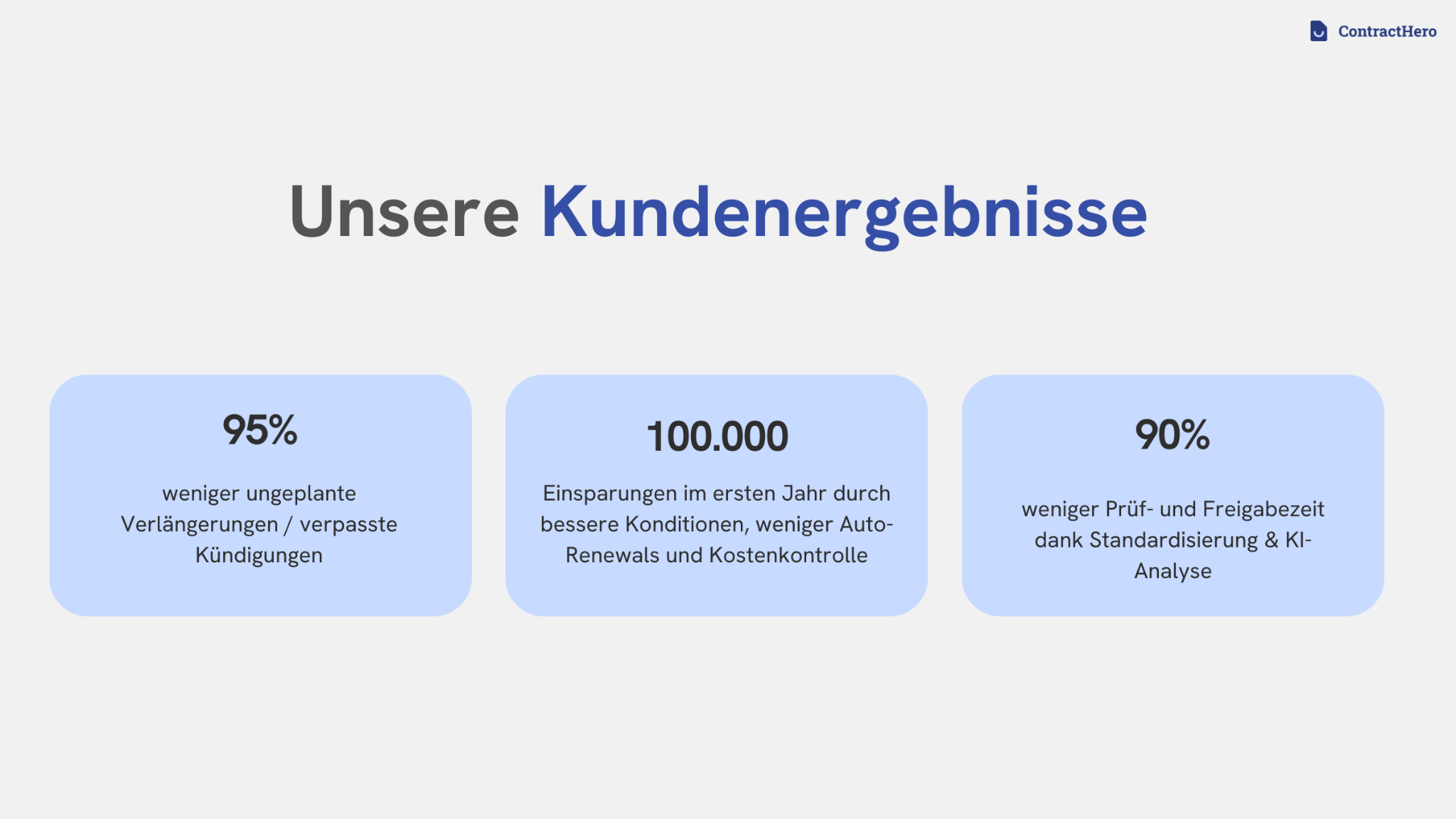ContractHero hat sich im Markt nicht durch Versprechen, sondern durch Ergebnisse etabliert. Für den Mittelstand bedeutet das eine schnelle, saubere Digitalisierung mit klarer Struktur, automatisierten Fristen und weniger Abhängigkeit von einzelnen Teams. Für Enterprise bedeutet es Governance und Multi-Entity-Fähigkeit, ohne die Organisation in starre Prozesse zu zwingen. Für Finance und Legal bedeutet es Transparenz über Werte, Fristen und Entscheidungen, die im Alltag belastbar sind.