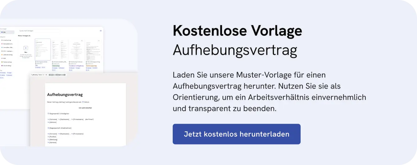 A termination agreement is a written agreement between the employer and employee that terminates the employment relationship by mutual consent. Unlike a notice of termination, which is issued unilaterally, a termination agreement requires the consent of both parties. This form of termination opens up a wide range of options: in addition to the exact termination date, provisions can also be made regarding severance pay, remaining vacation entitlements, leave of absence or a qualified reference. The termination agreement is a frequently used instrument, particularly in situations in which a termination would be legally uncertain or a quick solution needs to be found.