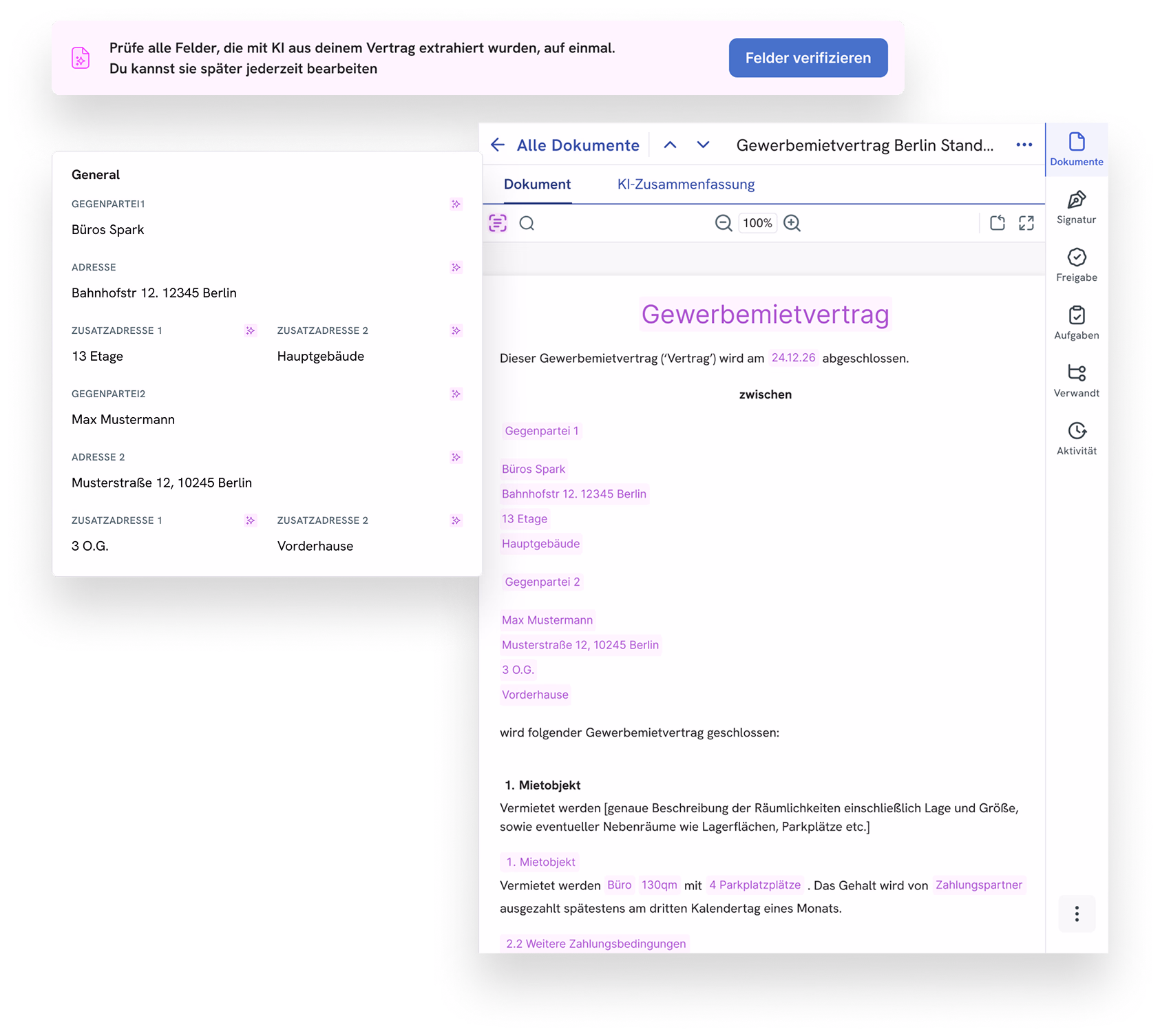 This information is structured and can be stored in a contract management software such as ContractHero. Automation eliminates manual steps such as transferring data and creating reminders, which saves time and reduces errors. In addition, automatic analysis enables scalable processing even with large volumes of contracts.